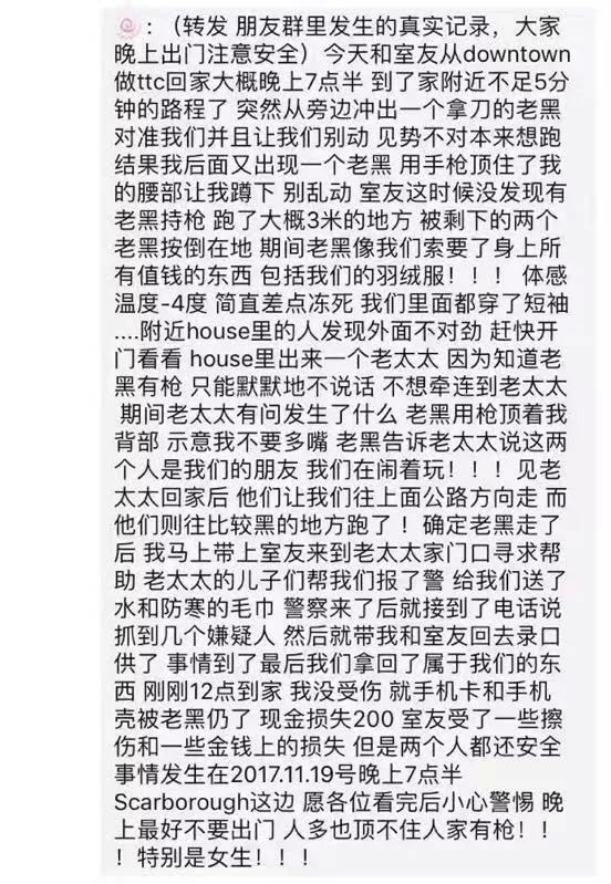 2017年差不多同一时间,一名多伦多的留学生也爆料自己遭到了抢劫。