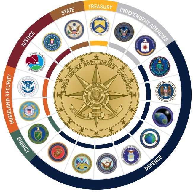 美国的情报界共由17个行政部门机构和组织组成,通常被称为“IC elements”(情报组织成员),它们开展各种情报活动并共同努力促进国家安全。 DNI(Director of National Intelligence)是IC(Intelligence Community/情报组织)的领导者,通过制定国家情报战略确定IC的战略重点。每个IC成员通过执行其使命完成其情报任务。