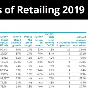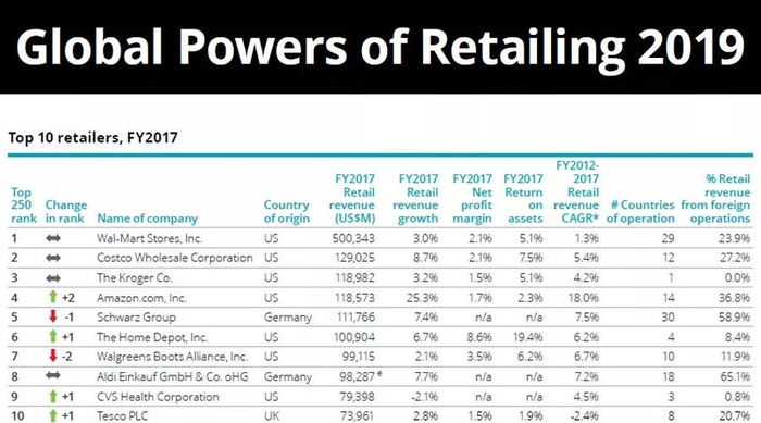 德勤(Deloitte)根据2017财年(截至2018年6月的财政年度)全球各大零售商公开的数据,发布2019年度全球零售商力量报告(Global Powers of Retailing 2019)。沃尔玛仍然位居第一,但亚马逊继续上升至第四位。中国名次最高的是京东,升至第20位。