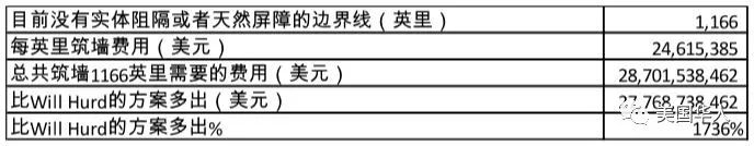 但是如果是按照特朗普筑墙方案,要覆盖目前没有屏障的1166英里边界线,总共筑墙费用就需要287亿美元,我们作为纳税人要多付277.7亿美元,超过Will Hurd方案的1736%。