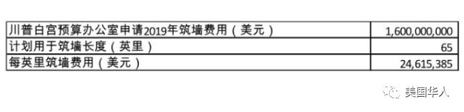 前文提到,特朗普自己的白宫预算办公室在2018年2月[11]提出2019年联邦财政年度预算申请方案中就只是要求16亿美元来修建65英里(第58页),即每一英里筑墙需要大约2462万美元。