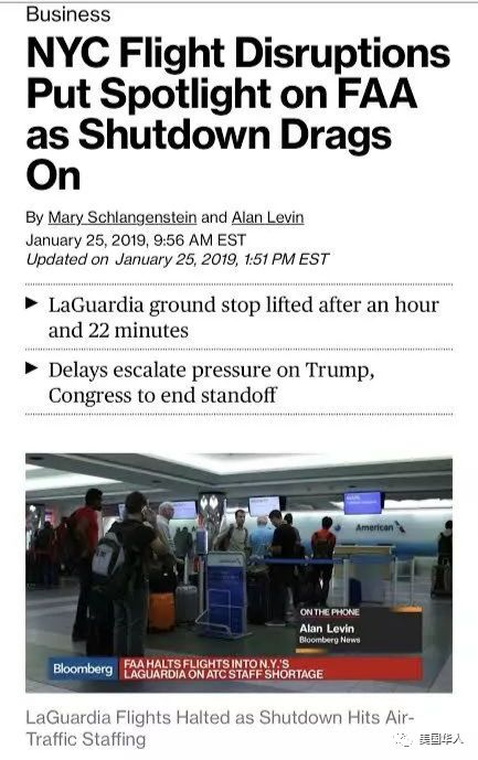 2019年1月25日联邦政府关闭进入第35天,八十万联邦政府员工面临连续第二次不会得到工资[7]。福克斯新闻的一个抽样调查显示[8] 54%的美国人表示如果连续两次工资停发,他们将无法支付日常生活的账单。就在这一天早上,因为越来越多的空中交通管制人员处于病休状态(“Sick Leave”),位于纽约皇后区的拉瓜地亚机场被迫暂停运作[9],而位于新泽西州的纽瓦克机场也面临严重的航班延误。