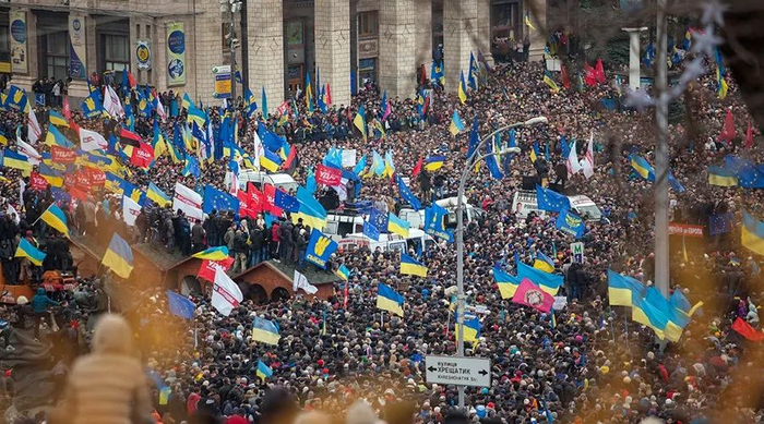 这个消息公布之后,当天晚上就有小几百人在基辅广场抗议,呼吁政府收回这个决定并继续跟欧盟签协议。隔了一天到22号的晚上,聚集的人群已经增加到了大几千人,到了24号人数已经提高到了十几万人,一周后多达几十万,整个广场站的密密麻麻。