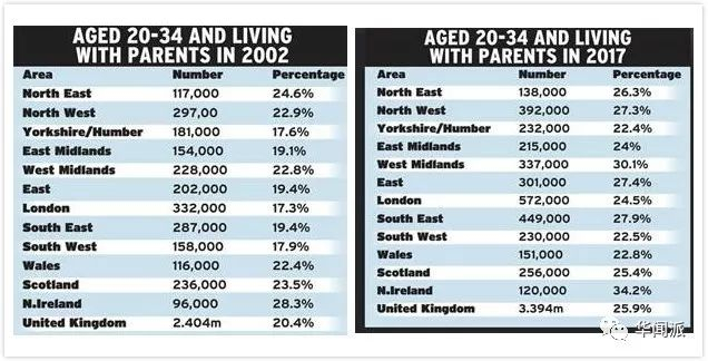 英国Civitas智囊团的数据显示,在英国20-34岁之间的成年人中,每年有四分之一居住在父母家中,总数为340万,比90年代末高出三分之一,主要原因来源于住房费用所带来的危机。