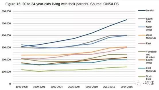 ▲英国1996-2015年各地与父母同住的青年人群数量增长情况,伦敦和西南地区增长尤为明显