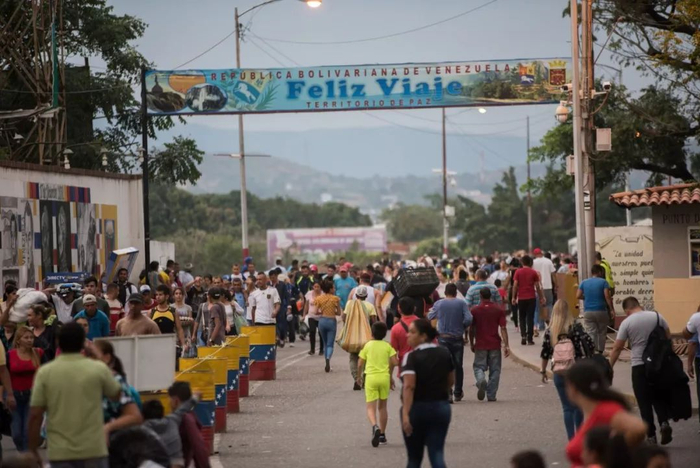 当地民众通过委内瑞拉和哥伦比亚边境的西蒙·玻利瓦尔国际大桥。新华社发
