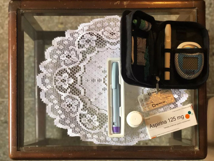 德拉奥斯的血糖仪、胰岛素笔,以及平时服用的药品。新华社记者高春雨摄