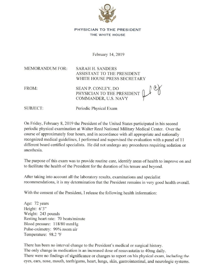 On Friday, February 8, 2019, the President of the United States particiated in his second periodic physical examination at Walter Reed National Military Medical Center。 Over the course of approximately four hours, and in accordance with all appropriate and nationally recognized medical guidelines, I performed and supervised the evalutation with a panel of 11 different board certified specialists, He did not undergo any procedures requiring sedation or anesthesia。