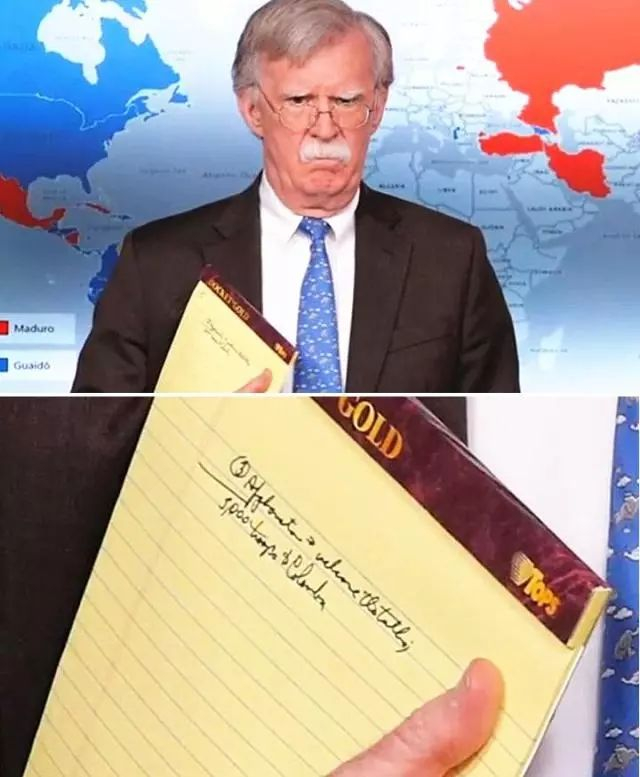 眼尖的媒体立刻发现,博尔顿手中的本子上赫然写着“向哥伦比亚派兵5000人”的字样。