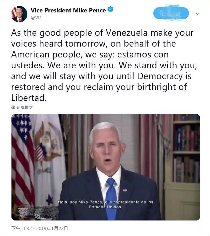 就在“一国二主”闹剧发生的前一天,美国副总统彭斯向委内瑞拉的反对派送去了“神助攻”。他在社交媒体上发布视频,煽动反对派上街追随瓜伊多,还用有点尬的西班牙语号召道:“我们与你们同在(estamos con ustedes)。”
