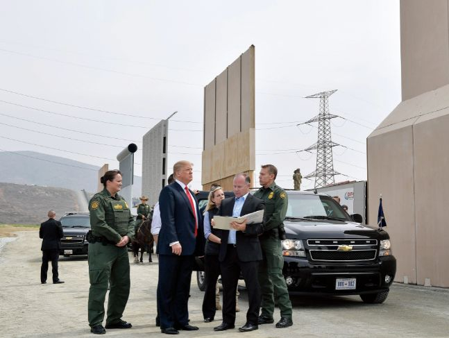 2018年3月13日,美国总统特朗普在加利福尼亚州圣地亚哥视察边境墙模型,这是他就任总统以来首次访问加州。在参观了“样板墙”后,他发表讲话说:“边境墙是我们的第一道防线,边境墙的存在有助于减少犯罪、毒品泛滥、福利欺诈以及教育和医疗负担,从而挽救成千上万条生命,并为纳税人节省数以亿计美元。”
