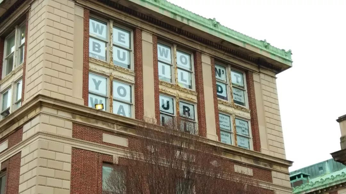 ▲ 美国 哥伦比亚大学 窗口上的示威标语:我们不会建造你的墙