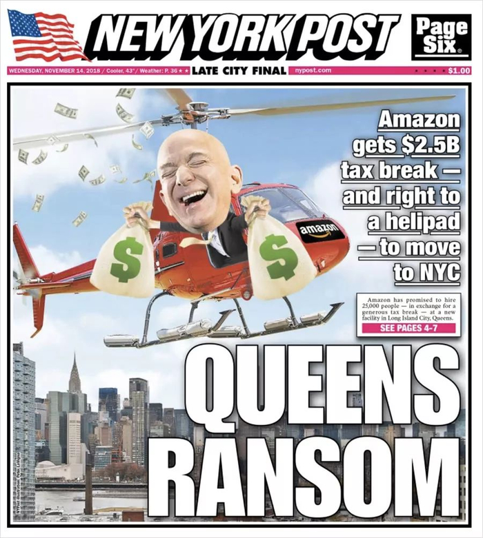 纽约地方报纸《纽约邮报》就制作了这么一个头版封面丑化贝索斯。