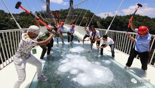 但张家界这座玻璃大桥作为领衔者,在试运营期间,也用了一些吸睛战术来让人们相信其安全性,如“30余人用铁锤轮番猛砸”“25名成人同时跳跃”等安全承重试验。它似乎也在用实力向世人证明,中国制造,是值得信赖的。