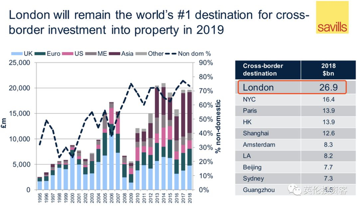 Savills预测伦敦在2019年还能继续保住第一名的位置,在全世界范围内吸收到最多的资金。