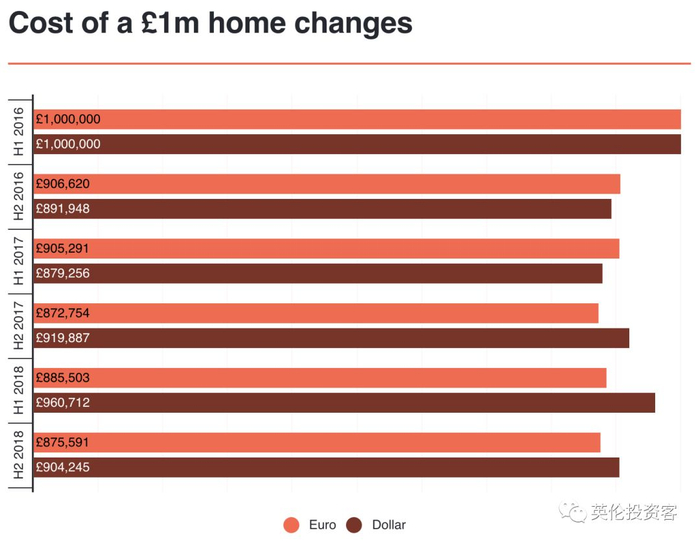 如上图所示,2016年上半年一个美元买家花100万英镑才能拿下的房产,如今相当于只需要90.4万英镑,便宜了近10万英镑。