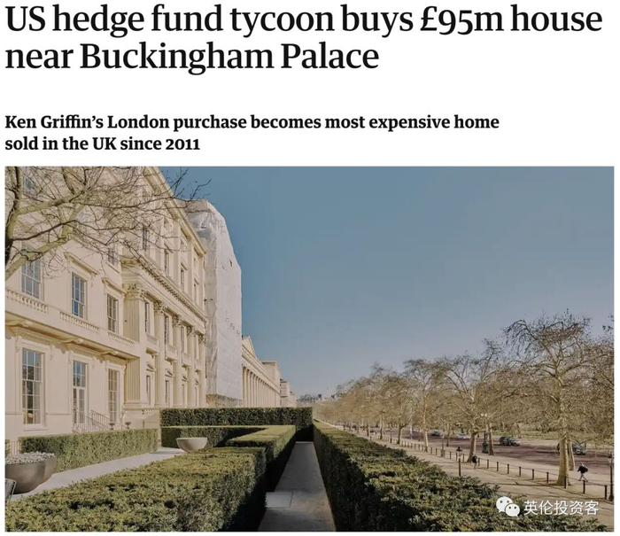2019年1月21日,美国对冲基金Citadel创始人、亿万富豪Ken Griffin斥资9500万英镑(1.22亿美元,8.55亿人民币),买下了白金汉宫旁边的超级豪宅——伦敦卡尔顿花园三号(3 Carlton Gardens)。