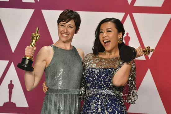 石之予(右)夺得奥斯卡最佳动画短片奖。图片来自美联社