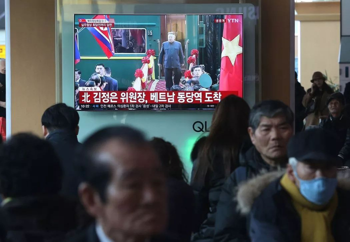 周二,韩国电视台播放金正恩抵达越南的新闻。 KIM CHUL-SOO/EPA, VIA SHUTTERSTOCK
