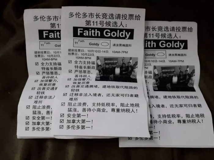 然而,温哥华华人媒体却积极为人民党拉票,多伦多华裔政客刘燕(Christina Liu)和Rolia枫下网站也分别为Faith Goldy拉票,华裔选民果然不负这些华社领袖的期望,纷纷走出家门,为人民党获得11%的选票和Faith Goldy名列市选第三立下了“汗马功劳”。