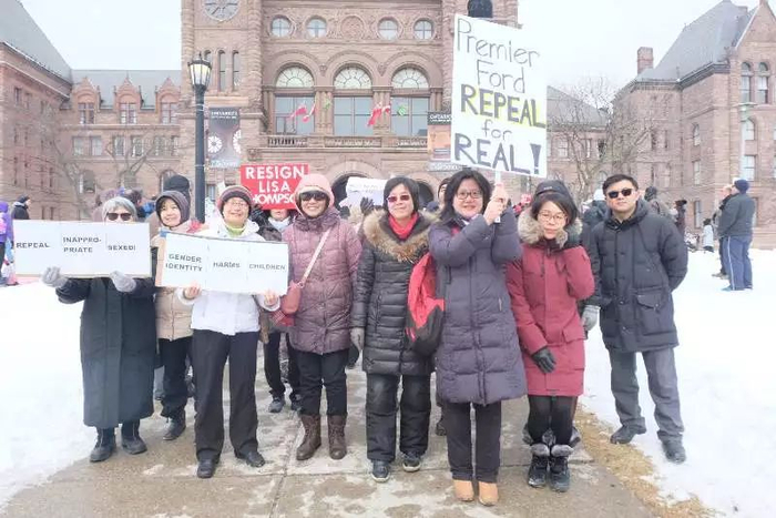 2月20日,华裔在安省政府门口抗议新版性教育大纲