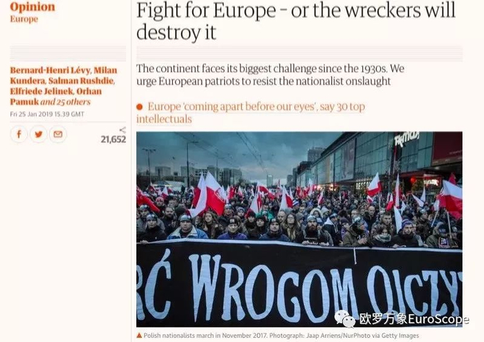 要记得,一年半以前,一群自诩保守主义者的欧洲知识分子也写了一封公开信,叫做“一个我们可以信靠的欧洲”,号召欧洲维护自己的传统,回到民族国家,拒绝难民和多元文化主义。如今自诩为欧洲自由而战的这篇,则是与他们立论相反的“姊妹篇”。保守主义的公开信将当今欧盟的支持者称为“多元文化的虚假欧洲”。“自由欧洲”派反唇相讥,嘲讽保守派是“虚假的先知”。