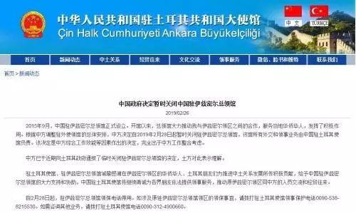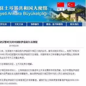 据中新网3月1日报道,中国驻土耳其大使馆网站消息,根据中方调整驻外使领馆的总体安排,中方决定自2019年2月28日起,暂时关闭驻伊兹密尔总领馆,该馆所有外交和领事业务由中国驻土耳其使馆负责。该决定是中方综合工作效能等因素作出的决定,完全出于中方工作整合考虑。