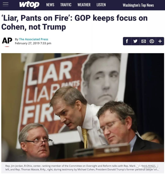 有意思的是在周三的科恩听证会上,几乎所有共和党议员都步调一致,一个个劈头盖脸痛批科恩撒谎,说他是个大骗子,因为他撒了慌所以他的话一句都不能信等等。共和党众议员麦兜斯还制作了一个带有科恩头像的”Liar, Liar, Pants on Fire“大牌子带到了听证会现场。许多共和党议员把自己可以提问的五分钟时间让出几分钟给火力最猛的众议院监督委员会副主席、共和党众议员吉姆·乔丹。