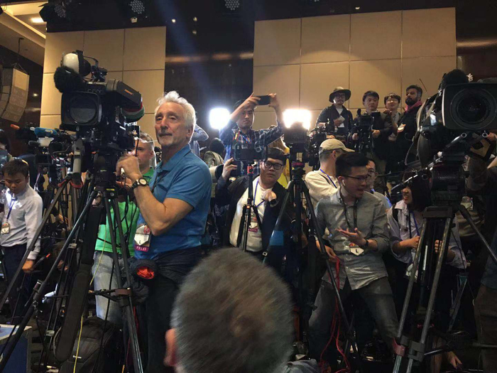 摄影记者们在后方看台上迅速架起脚架、拉收音线路,文字记者们则像被大风吹刮般,疯狂抢占仅有的 150 个座位。奔跑、拥挤、踉跄、然后迅速在能抢到的最可能靠近讲台的位置站定,整装、刷新快讯、还得赶紧回报后方编辑,现场最新情况。