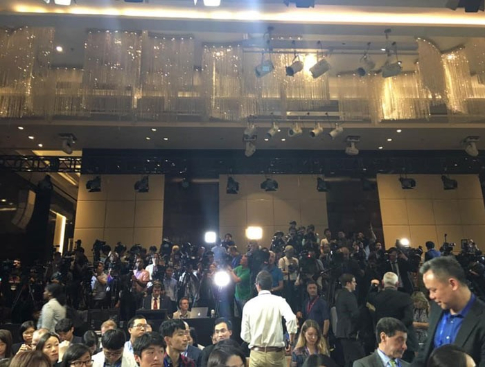 上午 10 点 53 分,白宫突然对随团记者发来一封标题为”紧急通知”的邮件,告知记者,白宫媒体大巴士将在 15 分钟后从国际媒体中心大门口出发,前往特朗普稍后举行记者会的地点── 9 公里外的万豪酒店。这比原本预计的发车时间,早了一个多小时。