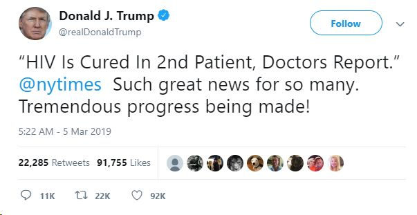 美国总统特朗普也忍不住发推特:“看了@纽约时报 的最新新闻,第二例被治愈的HIV感染病人出现了!这真的是个极大的好消息!(医学上)的重大进展!”