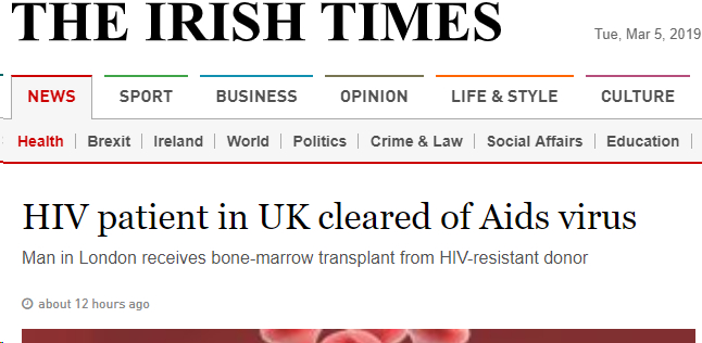 针对“伦敦病人”的病例研究报告已于3月6日发表在权威医学期刊《自然》杂志上。而世界各地的媒体,也迫不及待地给予了这个新闻最大的头条版面。