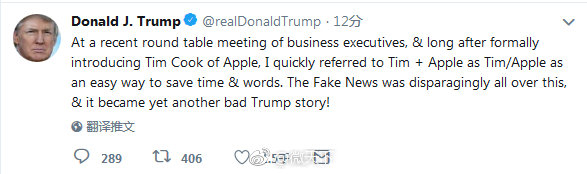 特朗普解释称:最近和企业领导的一次会议上,在正式介绍苹果公司的蒂姆·库克后,我很快将蒂姆+苹果称为“蒂姆·苹果”,这是一种省时省字的简单方法,假新闻在这方面都是贬低,这又成了一个坏的特朗普报道。