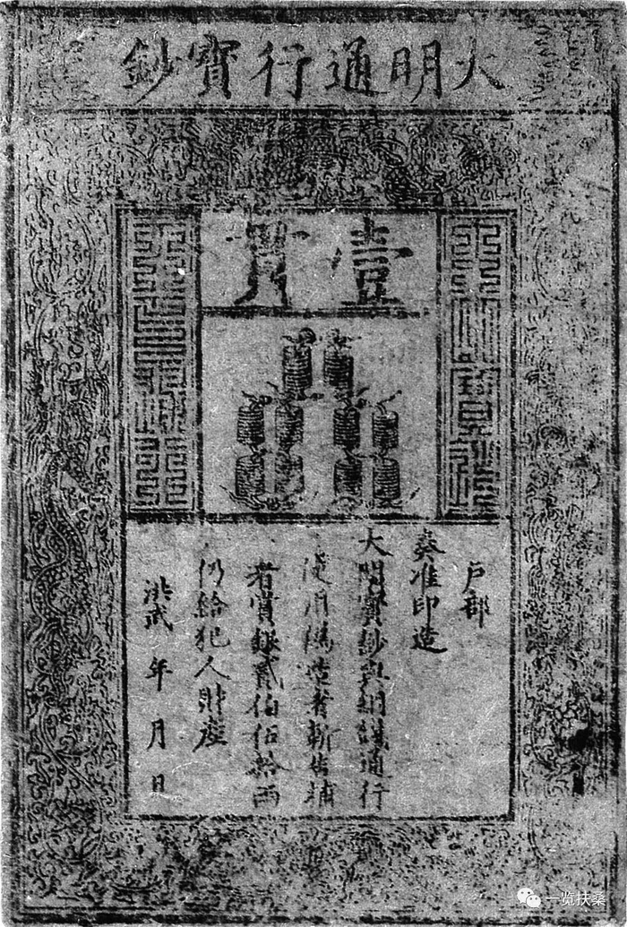 中国的元号比日本历史更久,图中明代发行的纸币上印有“洪武”字样