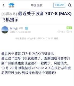 原发者来自一个分享飞行、酒店、信用卡使用心得的网站论坛。这名网友发帖于1月14日,帖子内容与上述微博基本一致,其称:最近关于波音737-8(MAX)飞行提示:最近这个型号飞机就别坐了,近期国航乌鲁木齐-广州航线,出现空速不一致提示,风险很大。(2018年)10月29日狮航坠机737-8MAX在执行从印尼雅加达到滨港也是这个问题吧。
