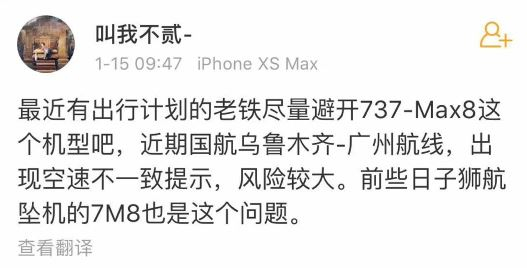 这条发布于1月15日的微博说:最近有出行计划的老铁尽量避开737-MAX8这个机型吧,近期国航乌鲁木齐-广州航线,出现空速不一致提示,风险较大。前些日子狮航坠机的7M8也是这个问题。