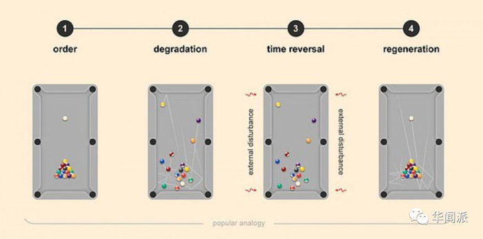 设想你现在正在打台球:开球前所有的球都按顺序摆成了一个三角形,而“量子比特”(Qubit)就是其中的一个球。它可以是任一颜色(Order),也可以在各种颜色中不停跳跃,形成“无序”(Chaos)状态。科学家们做的这个实验,就相当于一杆打过去,让球四下散开,变得不可控制,然后再让它们“逆转时间”,重新聚拢,排列成了最开始的三角形。这意味着量子比特回到了原始状态。(文科生出身的华闻君已经尽量去理解了,也欢迎懂行的读者来讲解一下)