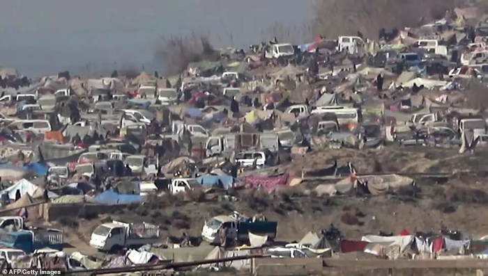 通过维和部队的望远镜,我们可以看到,在叙利亚巴古斯一片停车场大小的废弃土地上,散落着上百辆破旧不堪的卡车、简陋的帐篷,和一些包着头巾、四处走动的人。