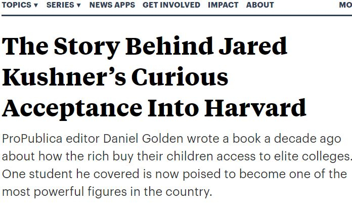 其实早在10年之前,《ProPublica》的编辑丹尼尔·戈尔登已经写过一本书,讲述富人如何花钱让子女进入精英大学。他声称自己的书揭露了美国高等教育的一个肮脏的秘密:富人用大量的免税捐款为成绩不佳的孩子购买进入精英大学。
