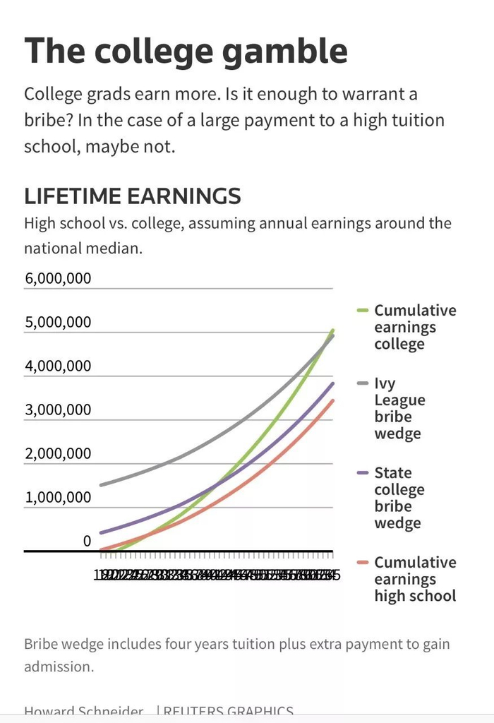 高代价行贿上精英大学, 其实并不合算;从会计成本和效益角度看, 高代价行贿上精英大学的终身收入水平, 比高中毕业生的终身收入水平高不了多少;如下图: