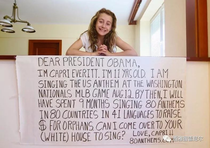 加拿大女孩Capri在11岁时立志为孤儿和被遗弃的孩子筹集资金,她和家人游历了80个国家,每到一个国家,Capri就用当地的语言唱国歌的方式为“SOS儿童村”筹资,鼓舞了很多国家的孩子们。