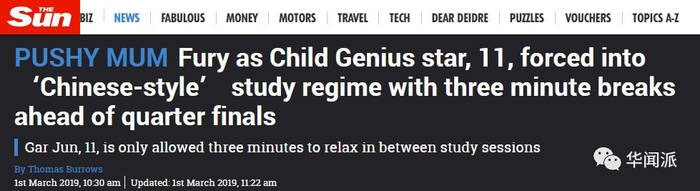 ▲《太阳报》:《天才男孩的妈妈惹众怒:她11岁的儿子被迫接受只允许三分钟休息的“中国式培训”,并晋级四分之一决赛》