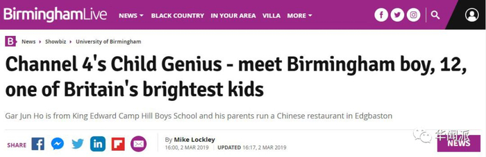 ▲伯明翰媒体报道:《四频道的<天才儿童>节目:12岁的伯明翰男孩成为英国最聪明的孩子之一》