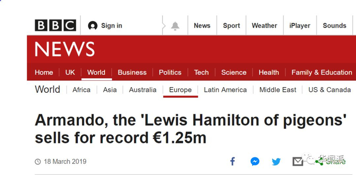 根据BBC的报道,在一个拍卖网站PIPA上,一名中国买家在网上“史无前例”地以142万美元(约合125万欧元,107万英镑)买下一只优质比利时赛鸽阿曼多(Armando),打破了2017年中国房地产大亨以37.6万欧元买下赛鸽仟翼(Nadine)的纪录。