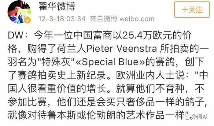 前几天,华闻君写了一篇关于伦敦成为中国游客单笔消费最高城市(中国游客在伦敦人均豪买3.45万元!原来是为这个买单?)的文章,今天又看到一个关于中国人在海外豪买的新闻,只不过这次买的东西比较特别——一只赛鸽。