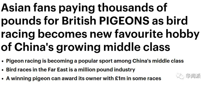 2013年,《每日邮报》就曾报道了中国买家花巨资购买赛鸽的新闻,文章分析认为,赛鸽运动成为了中国崛起的中产阶层的“新宠”,中国鸽赛奖金已飙升到了100万镑。拥有速度快的赛鸽不仅成了中国重要的社会地位象征,在中国买家的推动下,优良赛鸽的“身价”也飙越高。