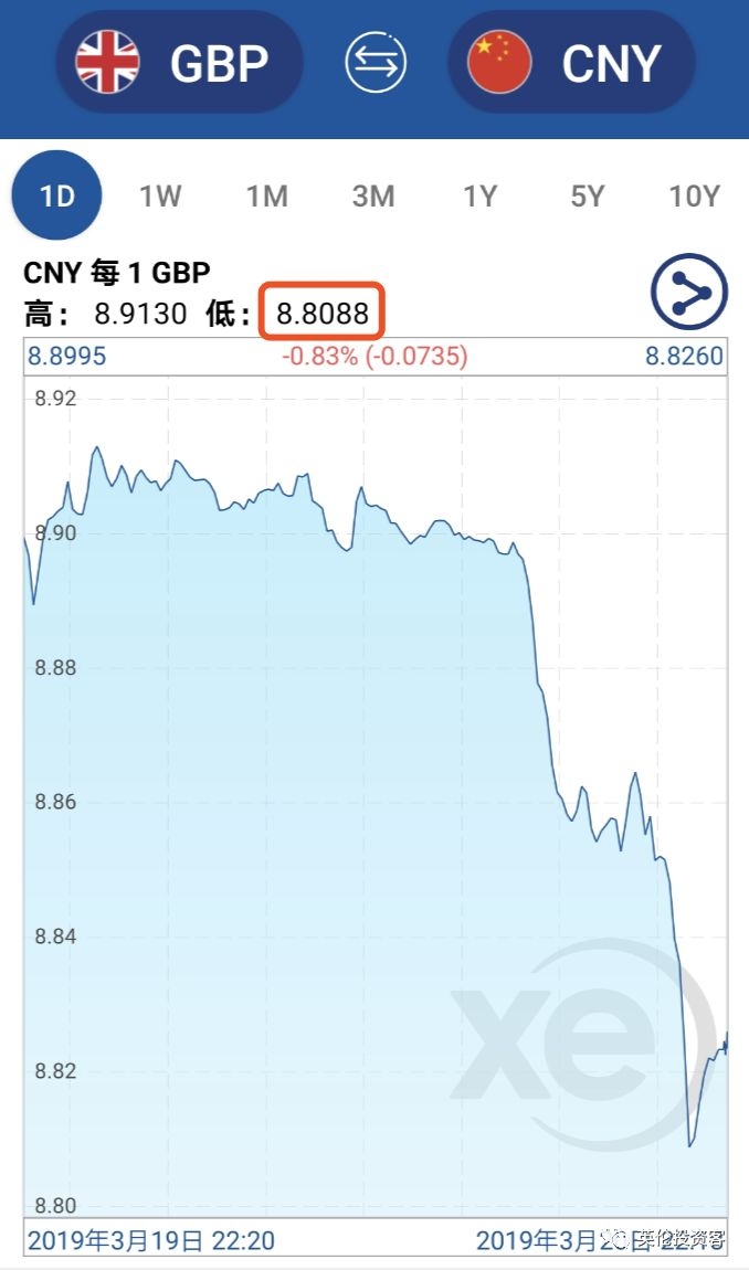 过去几个小时内,英镑兑人民币,从8.91一路跌回到8.8附近。