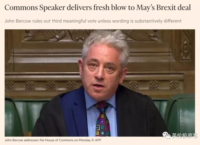 2019年3月18日,面对英国首相特蕾莎梅正在筹划的第三次议会投票,英国下议院院长John Bercow突然表示: