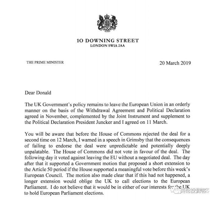 2019年3月20日,特雷莎·梅正式致信欧盟,请求推迟脱欧,但只要求延期三个月。