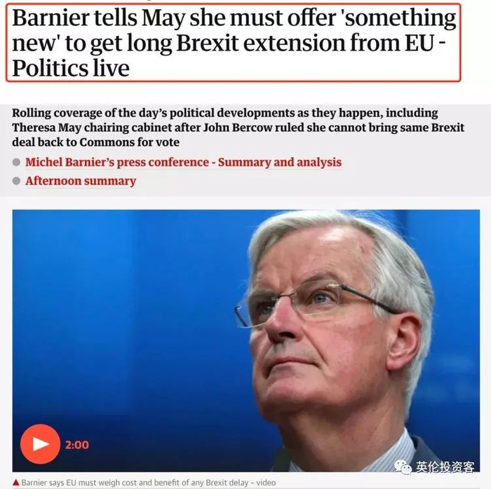 尽管欧盟对英国延迟脱欧持开放态度,但欧盟首席脱欧谈判官巴尼耶表示,英国需要提出一些“新的改变”来证明需要英国确实需要推迟脱欧,而不是在拖延时间。